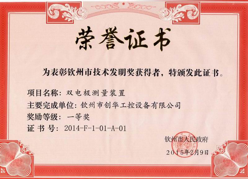 2015年12月30日下午3:00市委、市政府在市行政中心C座會(huì)議廳召開2015年欽州市科學(xué)技術(shù)獎(jiǎng)勵(lì)大會(huì)暨促進(jìn)科技成果轉(zhuǎn)化行動(dòng)推進(jìn)會(huì),我公司產(chǎn)品《雙電極測量裝置》喜獲2014年度欽州市技術(shù)發(fā)明一等獎(jiǎng)。